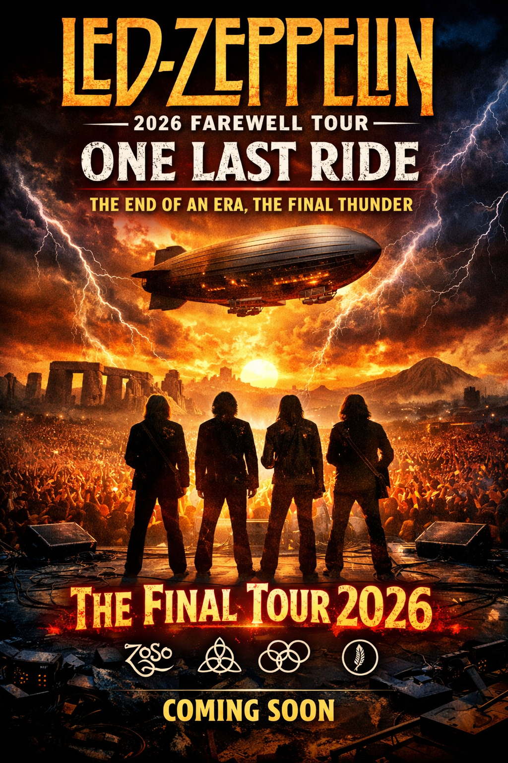 Led Zeppelin have announced a historic 2026 Farewell Tour titled “One Last Ride,” marking what is being described as the final chapter in the legacy of one of the most powerful and influential bands in music history. The announcement has sent shockwaves through the global rock community, uniting generations of fans for one last, thunderous celebration.
