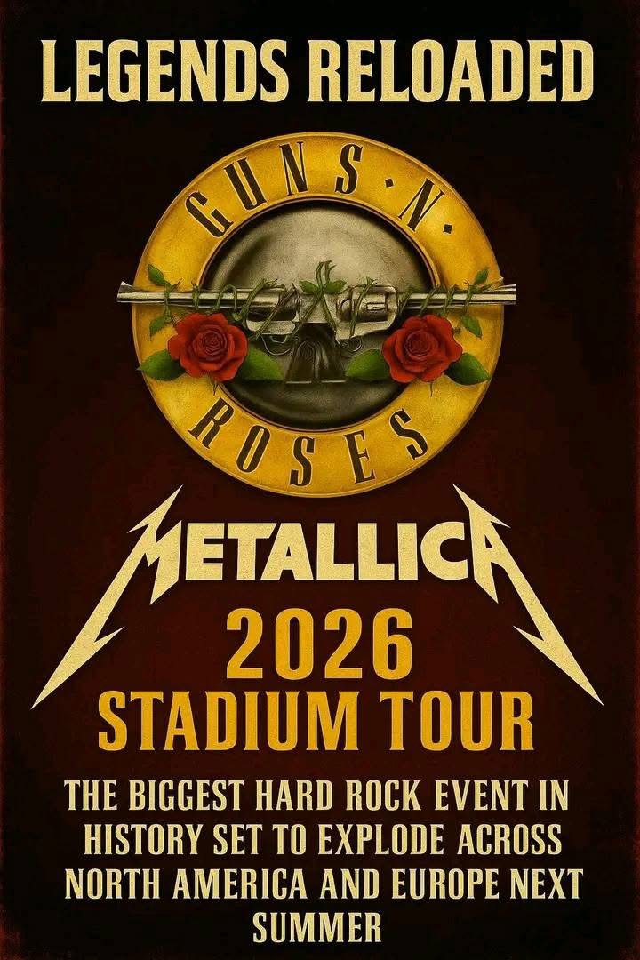 In a seismic announcement that’s shaking the foundations of the music world, hard rock giants Guns N’ Roses and Metallica are officially reuniting for the most explosive tour of the decade. Dubbed “Legends Reloaded 2026,” this once-in-a-lifetime stadium tour will blaze across North America and Europe next summer, delivering an unparalleled sonic spectacle that promises to make history.
