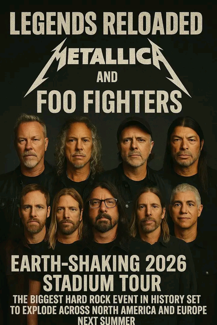 In a move that’s sending shockwaves through the rock world, **Metallica** and the **Foo Fighters** have announced a joint 2026 stadium tour — a once-in-a-generation event already being hailed as the **biggest hard rock tour in history**. Titled *“Legends Reloaded,”* the colossal trek will see both powerhouse bands share the stage across North America and Europe, delivering an explosive celebration of decades of rock dominance, resilience, and raw energy.