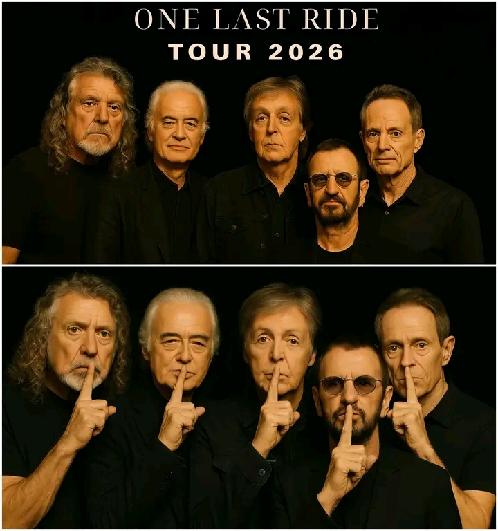 The music world stands still as something once thought impossible becomes reality. In a moment that defies time itself, five of the most iconic figures in rock history reunite—not for fame, not for fortune, but for a final farewell. Robert Plant, Jimmy Page, and John Paul Jones of *Led Zeppelin*. Paul McCartney and Ringo Starr of *The Beatles*. Two legendary bands. One stage.