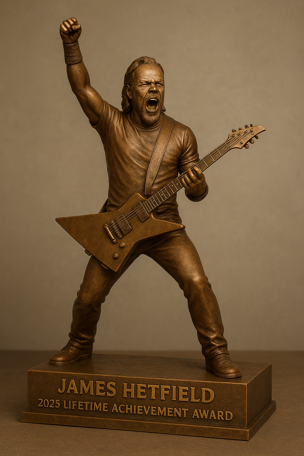 In a moment that solidifies his status as one of rock’s greatest icons, **Metallica frontman James Hetfield** has officially been honored with a **prestigious 2025 Lifetime Achievement Award Statue** for his monumental impact on music and culture. The ceremony, held in Los Angeles, brought together industry legends, fellow musicians, and lifelong fans to celebrate the man who helped redefine heavy metal over four decades.