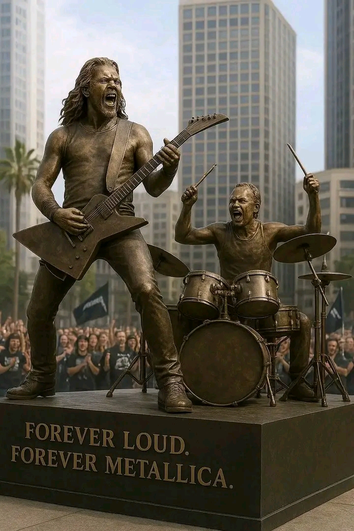 This week, heavy metal history was carved into stone — literally. Metallica’s legendary frontman **James Hetfield** has been immortalized with a stunning life-size statue unveiled in his honor, celebrating more than four decades of thunderous riffs, raw emotion, and uncompromising authenticity. The statue, revealed in Hetfield’s hometown of **Downey, California**, captures the frontman in his signature stance: guitar slung low, mouth open mid-roar, channeling the pure fire that has defined generations of rock fans.