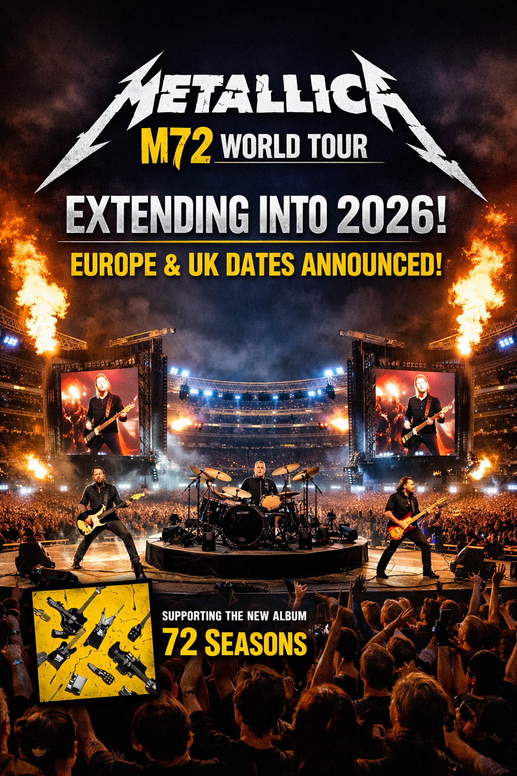 Metallica’s record-breaking **M72 World Tour** — launched in 2023 in support of their acclaimed album *72 Seasons* — is officially extending into **2026**, with a massive **European and UK stadium run** now confirmed. Already cemented as one of the **highest-grossing tours of the 2020s**, the M72 trek continues to redefine what modern heavy-metal touring looks like at the highest level.