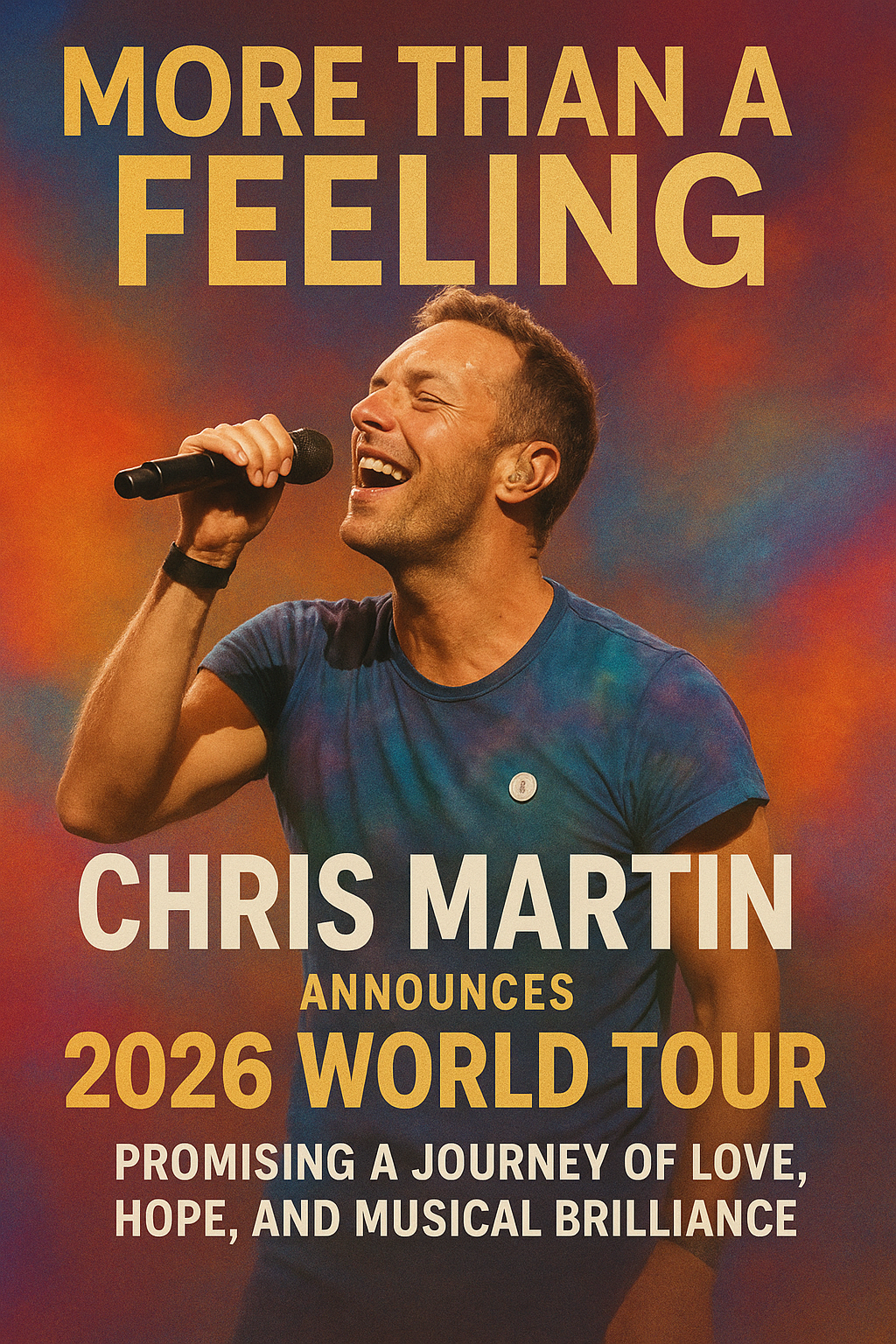 Chris Martin, the iconic frontman of Coldplay, has officially announced his highly anticipated 2026 World Tour, titled “More Than a Feeling, Time.” The tour is set to be a grand celebration of love, hope, and timeless music that has defined generations. Known for his emotional performances and uplifting anthems, Martin promises fans an unforgettable experience filled with light, color, and connection.