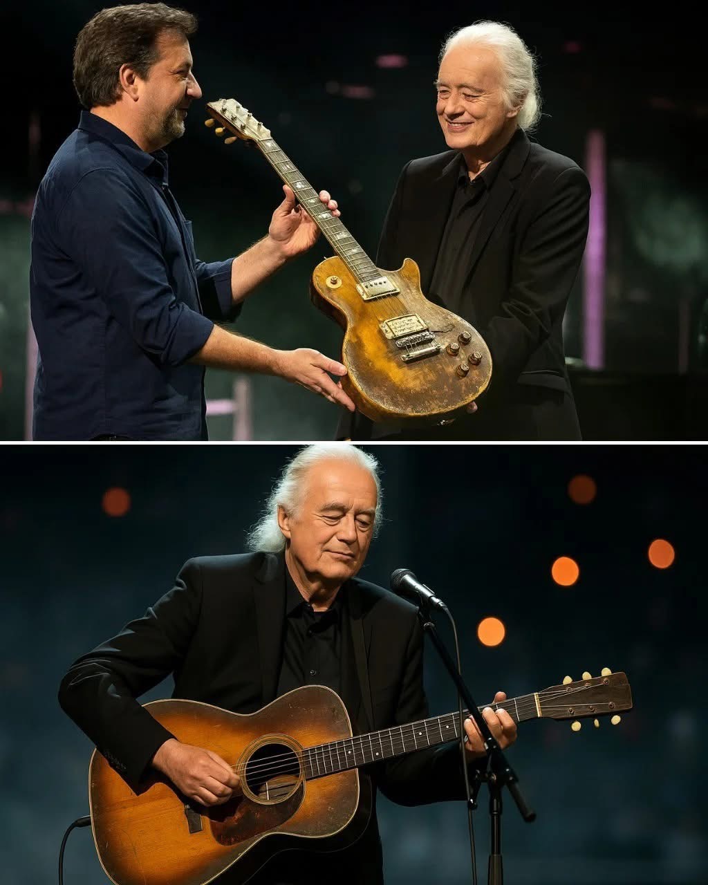 Witnesses describe Page’s reaction as deeply human. His hands trembled as he lifted the instrument, pressing his palm gently to its surface like a man greeting a long-lost friend. “I never thought I’d see this again,” he whispered — not into a microphone, but into the stillness that followed.