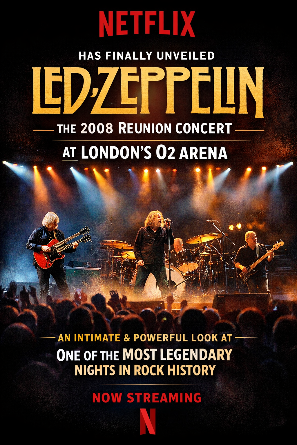 Netflix has finally unveiled a long-awaited documentary capturing **Led Zeppelin’s** historic 2008 reunion concert at London’s **O2 Arena**, offering fans an intimate and powerful look at one of the most legendary nights in rock history. The film revisits the band’s one-off performance on December 10, 2007 (released publicly in 2008), staged as a tribute to Atlantic Records founder Ahmet Ertegun, and widely regarded as Led Zeppelin’s final full concert.