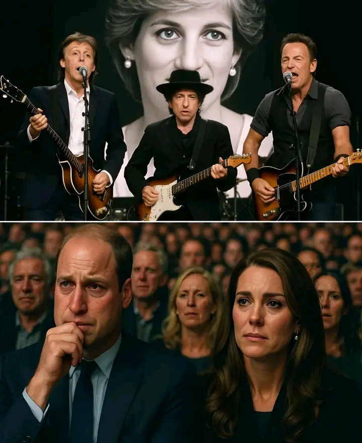 On July 18, 2025, Paul McCartney, Bob Dylan, and Bruce Springsteen stood together for the first and only time—not for fame, but for Diana. There were no cameras, no press—just candlelight, white roses, and a grief that still hadn’t healed after 28 years. McCartney whispered, “This one’s for you, Diana. We never stopped missing you,” before his voice cracked during Let It Be. Dylan’s raspy Knockin’ on Heaven’s Door echoed against old footage of Diana hugging sick children. Springsteen closed the night with You’ll Never Walk Alone, but halfway through, his eyes filled, his voice breaking as he murmured, “We’re still walking with you, Lady Di.” In the front row, Prince William’s shoulders shook as he held Kate’s hand. Prince Harry quietly sobbed, whispering to Meghan, “She would’ve loved this.” Even King Charles, known for his restraint, could be seen dabbing his eyes, unable to contain the weight of the moment. There was no encore. No speeches. Just silence—heavy, sacred, and soaked in memory. And in that stillness, Diana’s light came back—if only for one night….