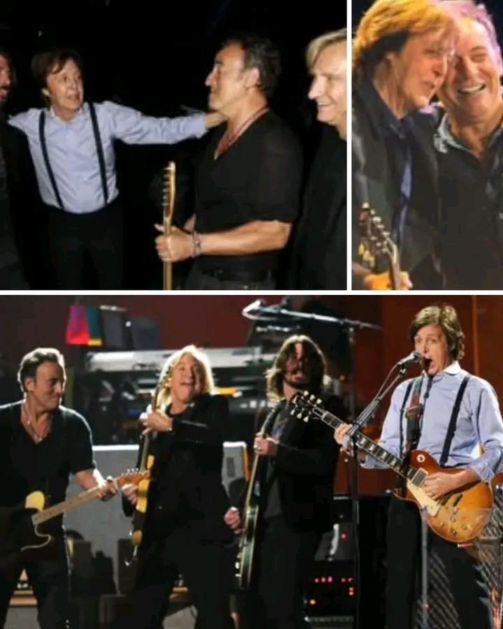The crowd, already on its feet, lost it when the band broke into *“The End”*—the climax of Abbey Road’s iconic B-side medley. In a thrilling finale, the three guitarists took turns trading solos, recreating the famous final guitar duel originally recorded by McCartney, George Harrison, and John Lennon. McCartney, Springsteen, and Walsh each delivered blistering, soulful riffs while Grohl grinned behind the drum kit, anchoring the chaos with raw power.