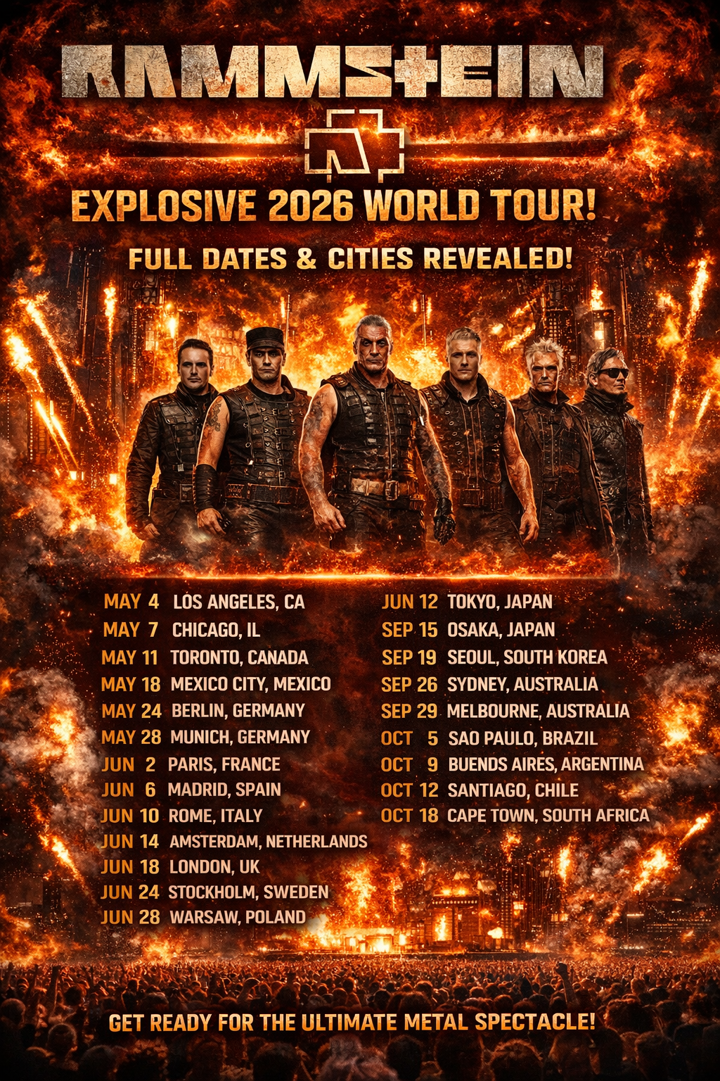 Rammstein have officially announced an explosive 2026 world tour, sending waves of excitement through the global metal community. Renowned for their uncompromising sound, industrial precision, and jaw-dropping stage production, the German metal giants are preparing to bring one of the most ambitious live spectacles of their career to fans across multiple continents.