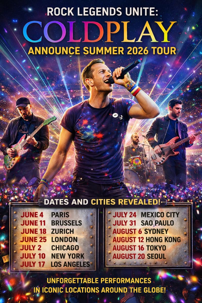 Rock legends Coldplay have officially set the global music scene on fire with the announcement of their highly anticipated **Summer 2026 World Tour**, revealing an exciting lineup of dates and cities across multiple continents. After years of record-breaking performances and sold-out stadium shows, the band is ready to return bigger, bolder, and more spectacular than ever.