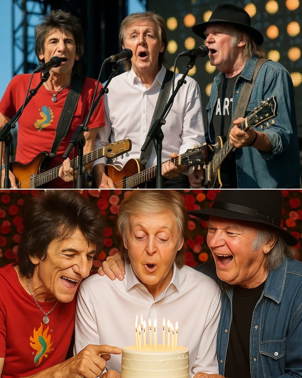 Ronnie, caught off guard by McCartney’s heartfelt gesture, initially stood still, overwhelmed by the presence of his longtime friends. The surprise wasn’t just about celebrating Ronnie; it was a moment that brought together three iconic musicians—Wood, McCartney, and Young—in a spontaneous, raw, and deeply authentic musical moment.