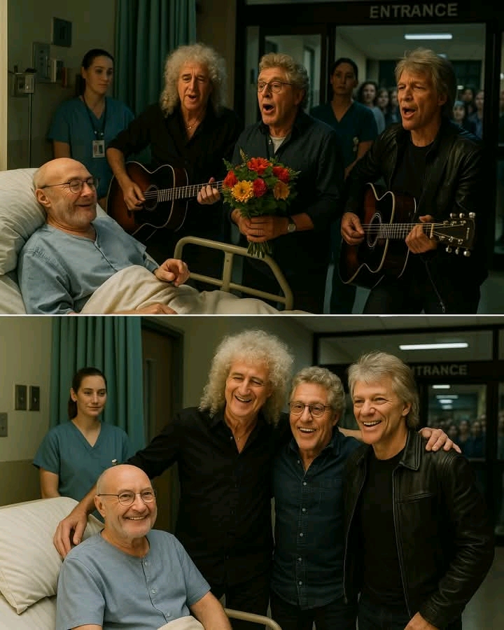 The entire rock world was shaken when Phil Collins — the legendary frontman of Genesis — was rushed to the hospital in the middle of the night after a sudden fainting spell. The news spread like wildfire, and within hours, the sterile corridors of the hospital were charged with quiet anticipation. Then came the sound — not of machines or alarms, but of footsteps and laughter echoing through the hall. Brian May, Roger Daltrey, and Jon Bon Jovi arrived together, guitars in hand, hearts heavy with concern and full of love.