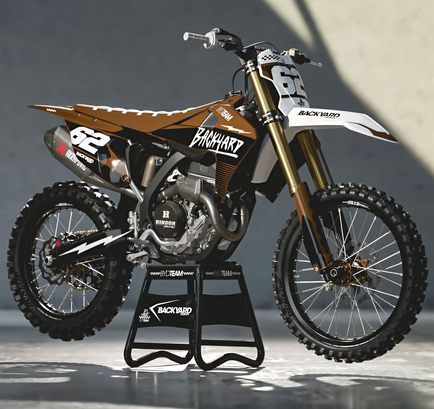 This particular setup transforms the CRF250R into a head-turner, blending bold color combinations, race-inspired patterns, and personalized logos or rider names. Whether it’s a sleek black-and-red theme with metallic finishes or a more vibrant neon aesthetic, the Backyard Design graphics make a strong statement. Riders can work directly with the design team or use the Backyard Design online configurator to create a one-of-a-kind look that reflects their style and personality.