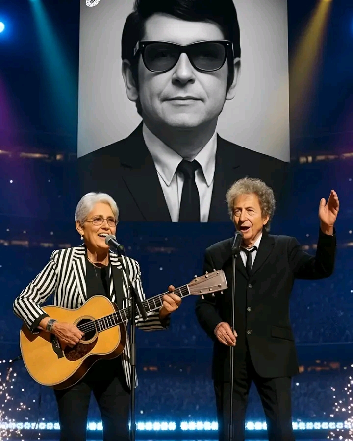 The lights dimmed, the crowd hushed, and Joan Baez stepped into the spotlight with quiet grace — a living legend paying tribute to another. Her guitar shimmered softly under the glow as she whispered, “This song is for my friend, Roy Orbison.” Behind her, a black-and-white image of Orbison appeared on the massive screen, his signature dark glasses and gentle smile casting a spell over the sea of 70,000 silent fans.