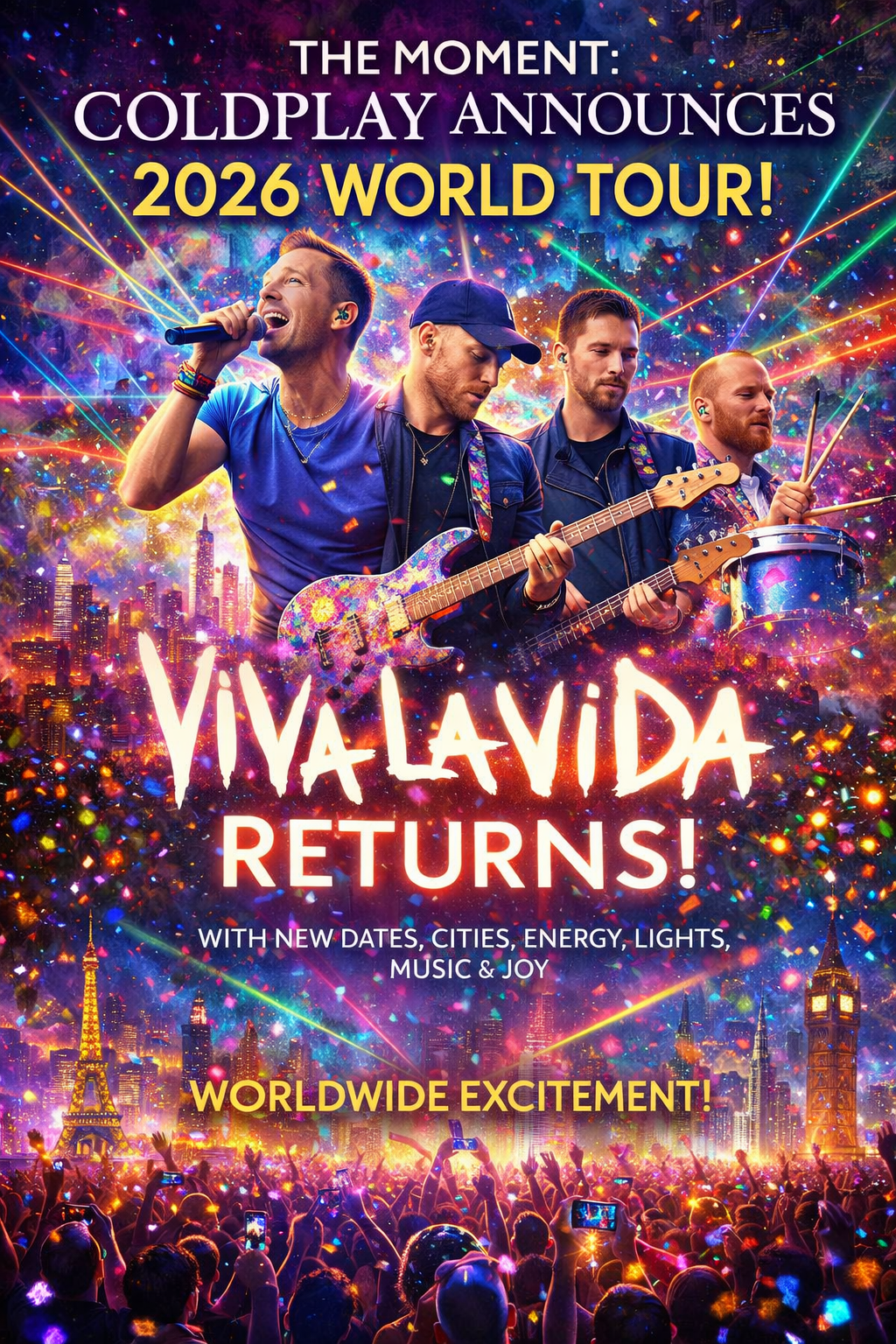 It was a moment fans around the world had been waiting for. With a burst of color, sound, and emotion, **Coldplay officially announced their 2026 World Tour**, bringing back the spirit of ***Viva La Vida*** in a celebration of music, light, and global connection. The announcement instantly ignited worldwide excitement, reminding everyone why Coldplay remains one of the most beloved live bands of all time.
