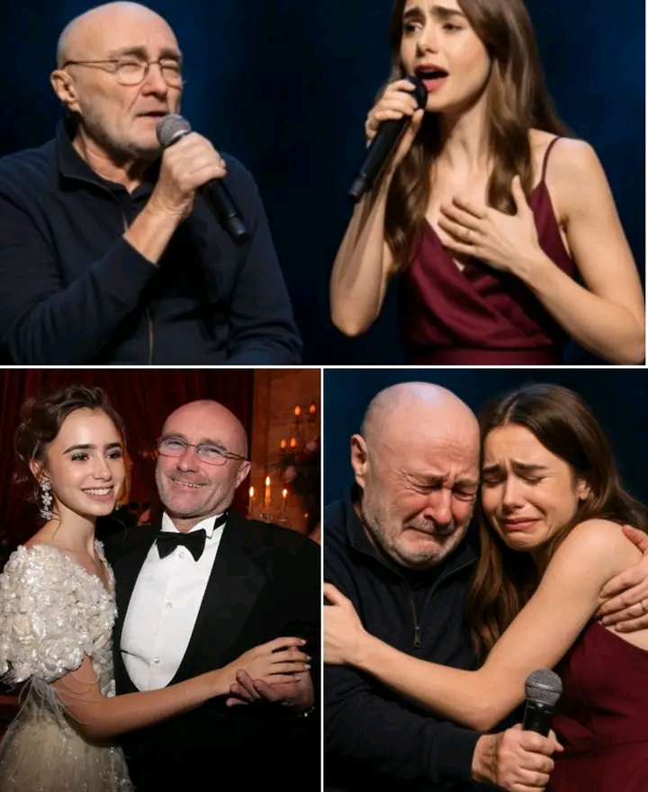 The moment Phil Collins stepped onto the stage beside Lily Collins felt like time itself cracked open. One second, she stood alone under the warm lights, preparing to introduce her next song… and the next, a familiar silhouette emerged from the wings. The crowd gasped before Lily even turned. But when she did — when she saw her father standing there, frail yet resolute, a microphone steady in his hand — her entire expression collapsed into pure, trembling disbelief.