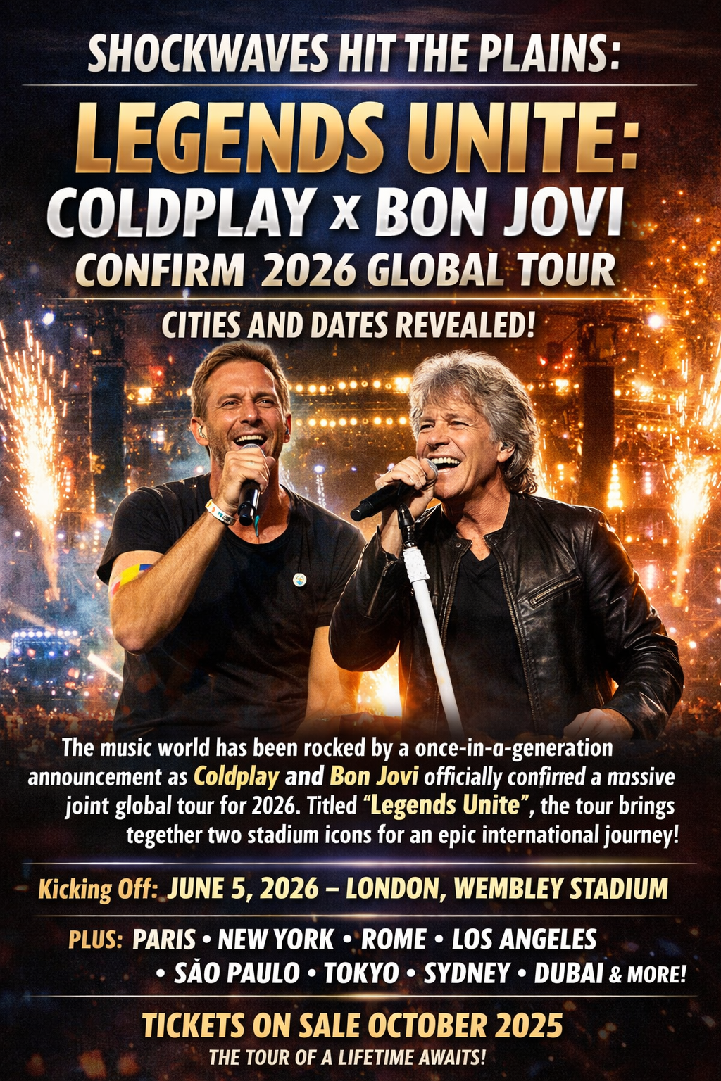 The music world has been rocked by a once-in-a-generation announcement as **Coldplay** and **Bon Jovi** officially confirmed a massive joint global tour for 2026. Titled *Legends Unite*, the tour brings together two stadium-dominating forces whose combined legacy spans more than three decades of chart-topping anthems and unforgettable live performances.