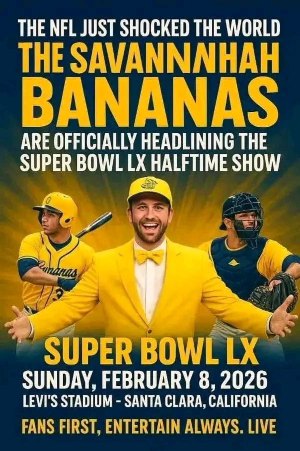 In a move that no one saw coming, the NFL has officially announced that the Savannah Bananas — the baseball team that redefined sports entertainment with their outrageous antics and circus-style fun — will headline the Super Bowl LX halftime show at Levi’s Stadium in Santa Clara, California. The news has sent shockwaves across the sports and entertainment world, as fans brace for what could be the wildest performance in Super Bowl history.