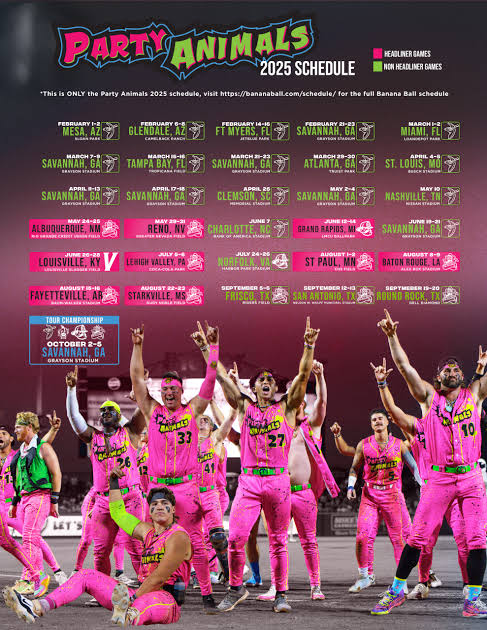 The Party Animals have unveiled their highly anticipated 2025 Banana Ball World Tour schedule, signaling a major leap in scale and reach for the wildly popular exhibition baseball team. Known for their fast-paced, entertainment-driven style of play, the Party Animals—rivals to the Savannah Bananas—are taking Banana Ball to unprecedented heights with this expanded tour.