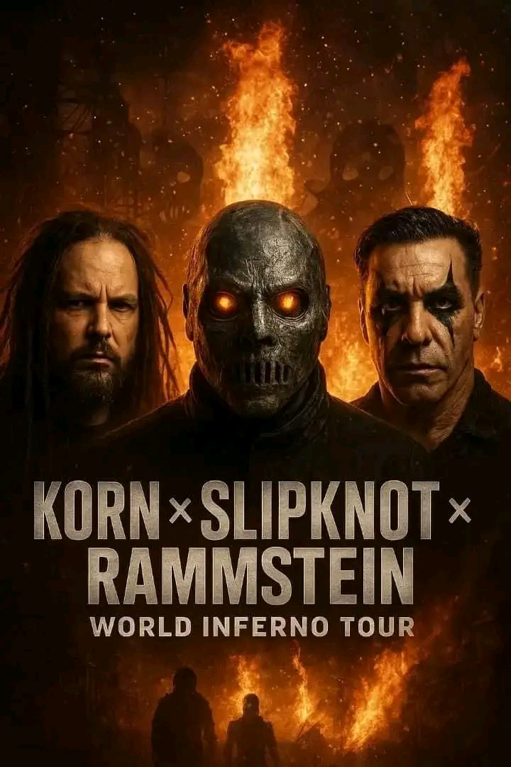 The rock and metal universe is officially on fire as **Korn**, **Slipknot**, and **Rammstein** have announced a once-in-a-lifetime **joint world tour** that is already being hailed as the most seismic collaboration the heavy music scene has ever witnessed. Uniting three of the most influential and theatrical forces in modern rock, the tour promises an unprecedented collision of nu-metal, industrial power, and masked mayhem—an event designed to shake stadiums to their foundations.