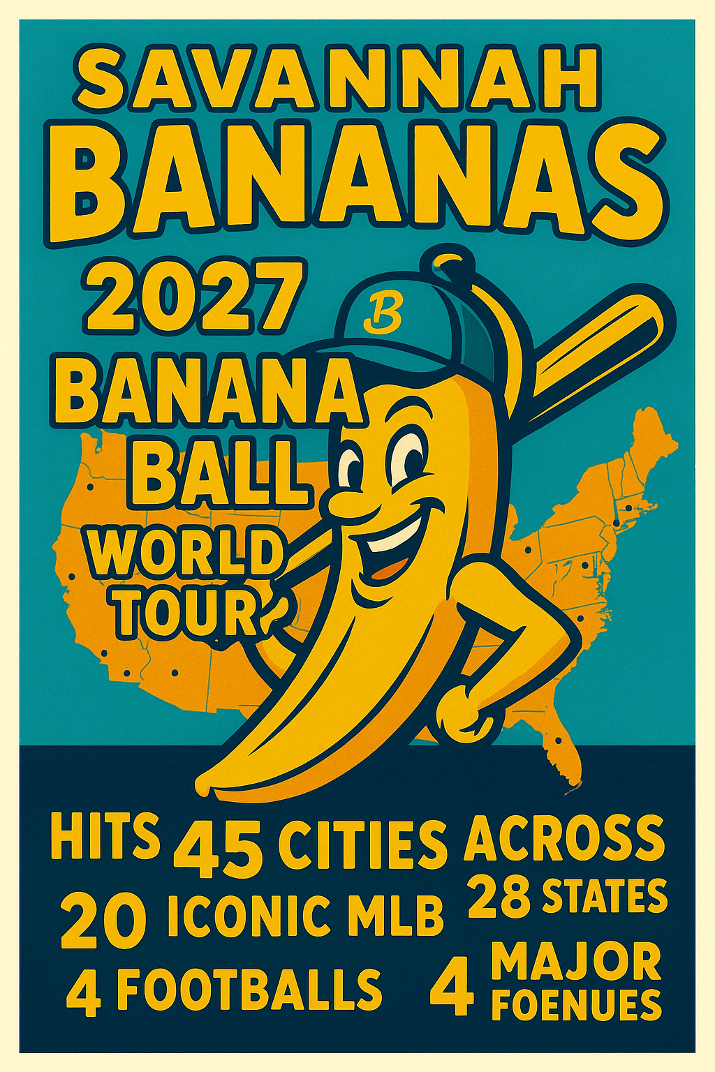 The Savannah Bananas are taking their show to unprecedented heights with the announcement of their 2027 Banana Ball World Tour. Known for revolutionizing the game of baseball with fast-paced action, nonstop entertainment, and fan-first energy, the Bananas will embark on their most ambitious journey yet — a tour spanning 45 cities across 28 states.