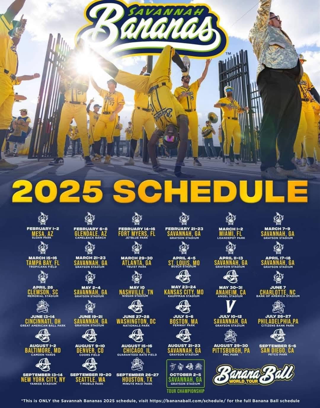 The Savannah Bananas are once again proving that baseball can be bigger, bolder, and infinitely more fun. The team has officially announced its highly anticipated **2025 Banana Ball World Tour**, and this year’s schedule is nothing short of groundbreaking. The Bananas will visit **45 cities across 28 states**, bringing their signature mix of baseball brilliance and jaw-dropping entertainment to fans across the country.