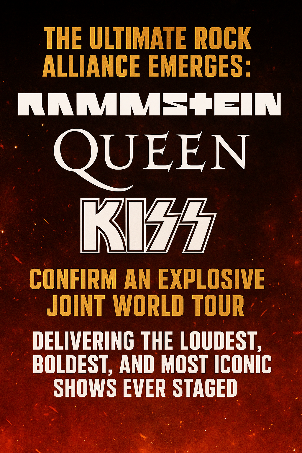 The tour — fittingly titled “Gods of Fire, Glam, and Glory: The World Union Tour” — merges Rammstein’s explosive industrial pyrotechnics, Queen’s soaring anthemic majesty, and KISS’s legendary larger-than-life charisma into a single cataclysmic event. Industry insiders say the production scale will dwarf anything touring today, featuring triple-stage setups, rotating headliners, and moments where all three acts appear together for special collaborative performances.