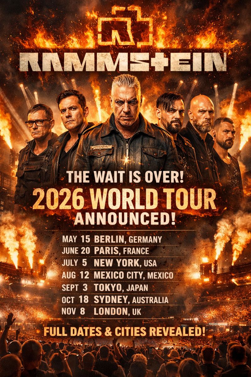 The wait is finally over. After months of speculation, cryptic hints, and rising anticipation among fans worldwide, **Rammstein have officially announced their explosive 2026 World Tour**, and it promises to be one of the most ambitious chapters in the band’s legendary live history. Known for redefining the concert experience with towering stage designs, blistering pyrotechnics, and uncompromising industrial power, Rammstein are once again preparing to take their spectacle across the globe.