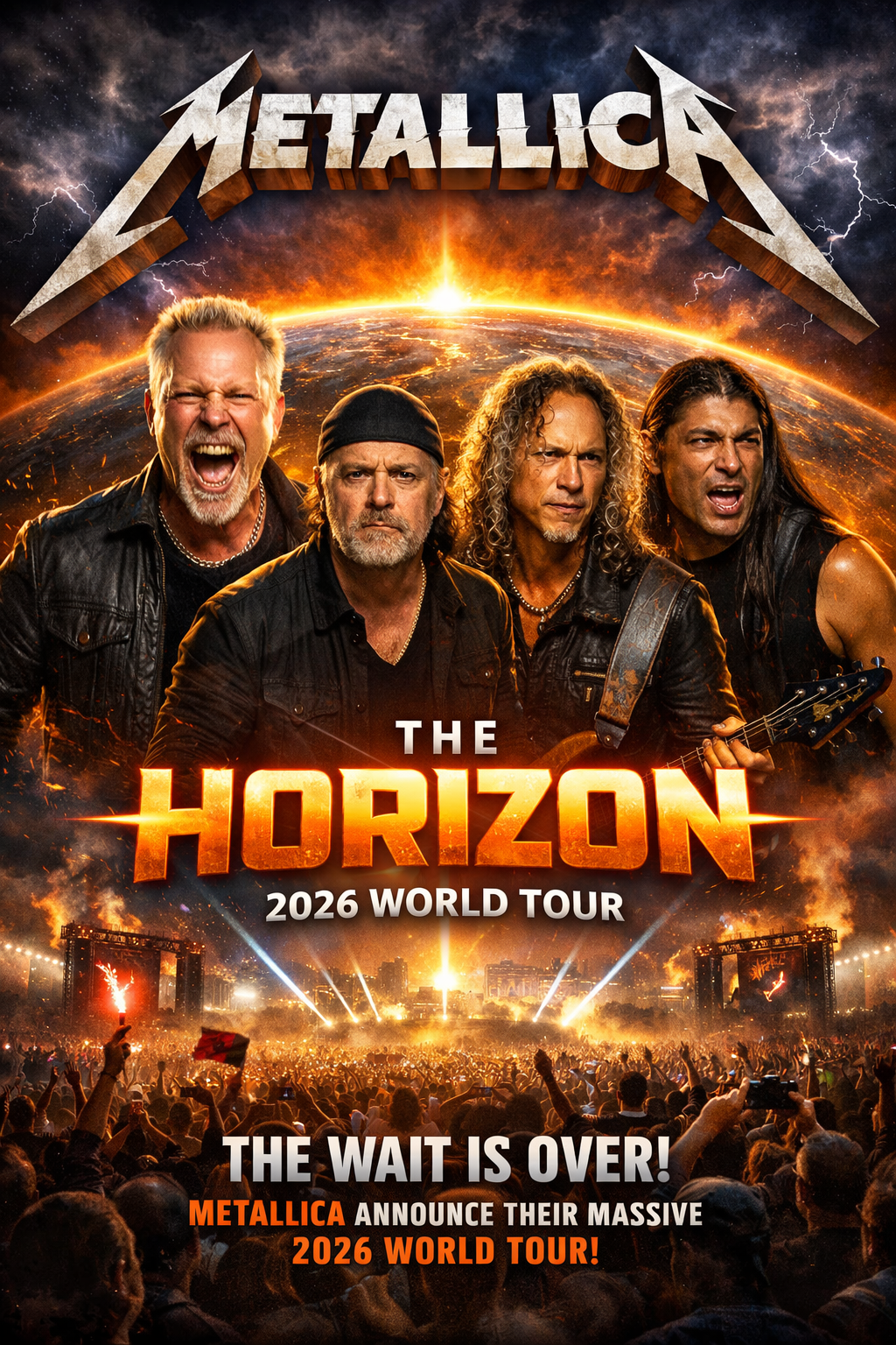 The wait is over. Metallica have officially announced their massive 2026 world tour, titled ***The Horizon***, igniting global excitement among millions of fans. The legendary heavy metal icons — **James Hetfield, Lars Ulrich, Kirk Hammett, and Robert Trujillo** — are set to bring their thunderous sound to stadiums and arenas across multiple continents in what promises to be one of the biggest rock tours of the decade.