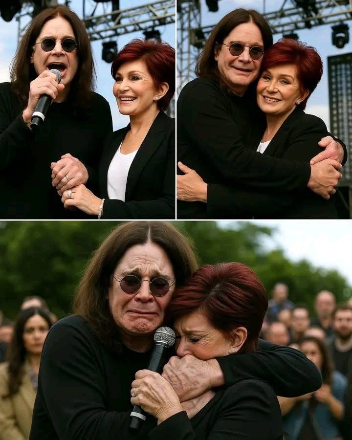 The roar died in an instant. Then, under a single spotlight, Sharon Osbourne walked onstage. Dressed in black, she trembled, visibly overwhelmed. Ozzy opened his arms and she fell into them. The moment was raw. Real. Devastating.