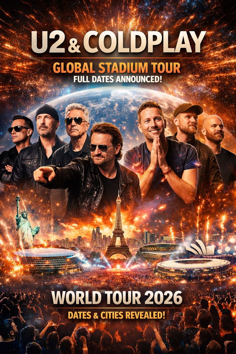 Music fans around the world are celebrating as **U2 and Coldplay officially announce an explosive, massive joint world tour**, marking one of the most anticipated collaborations in modern music history. This landmark event brings together two legendary bands known for redefining stadium performances with powerful anthems, immersive visuals, and unforgettable live energy.