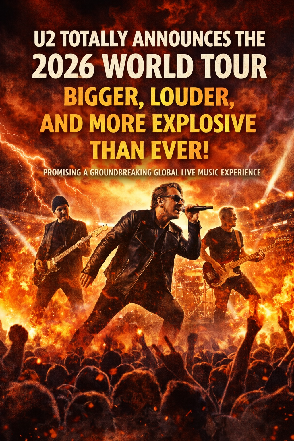 Legendary rock band U2 has officially announced a massive 2026 world tour, sending waves of excitement through fans across the globe. Known for redefining live music with groundbreaking visuals, powerful anthems, and emotionally charged performances, U2 promises that this upcoming tour will be their most ambitious and electrifying yet. According to the band, the 2026 world tour will be “bigger, louder, and more explosive than ever,” raising expectations for an unforgettable global spectacle.