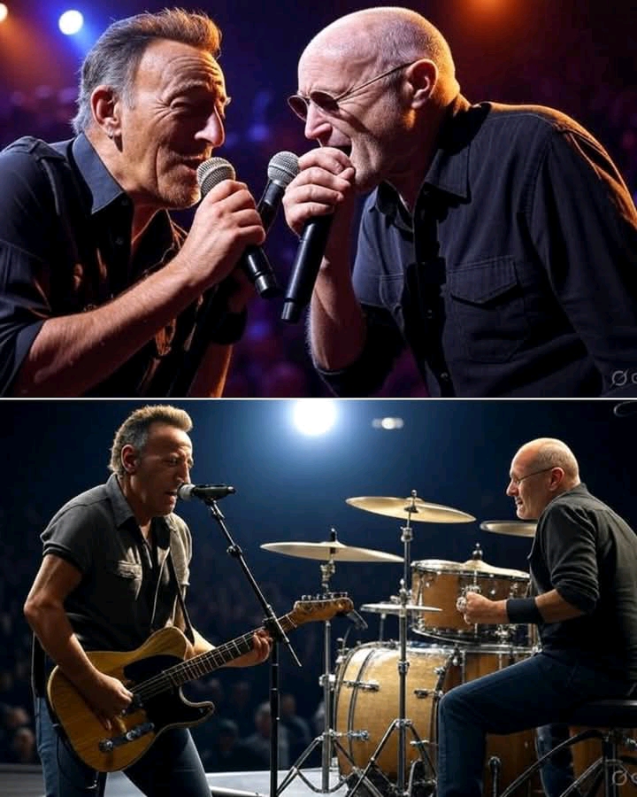 Under the golden haze of the stage lights, Bruce Springsteen and Phil Collins began to weave their voices into *Let It Be* — and the atmosphere shifted instantly. It was as if time had slowed, the room caught in a fragile suspension. Phones were lowered, conversations died mid-sentence. All that remained was the sound — two distinct voices melting into one, carrying Paul McCartney’s melody like a sacred offering.