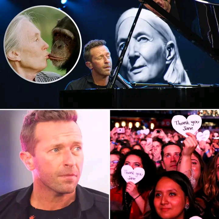 Under the soft glow of the stage lights in London, Coldplay’s Chris Martin paused his set to honor the late Dr. Jane Goodall, and what followed became one of the most emotional moments of his entire career. As thousands of fans held their breath, the usually energetic arena fell into a reverent silence. Martin stepped forward, his voice calm but heavy with emotion, as he spoke of Goodall’s legacy — her unmatched compassion for animals, her courage in standing up for the planet, and the hope she inspired in countless hearts around the world.