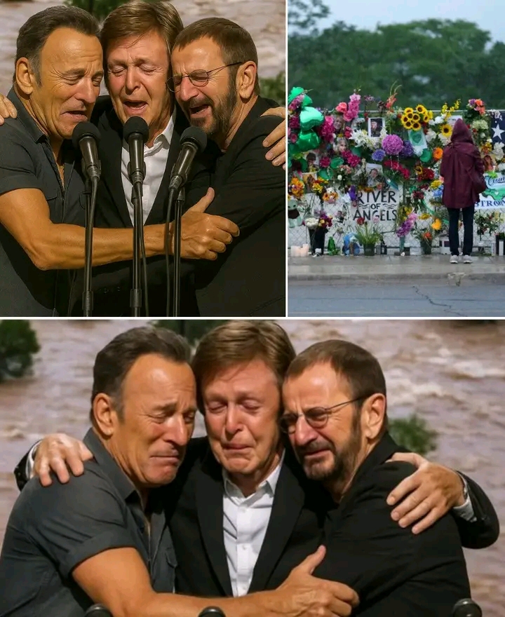 Bruce Springsteen stepped forward first, guitar in hand, flanked by Paul McCartney and Ringo Starr. The three legends stood not as icons, but as fellow mourners. They began *“If I Had Only Known,”* and instantly, the air thickened with emotion. Bruce’s voice, usually steel-strong, faltered—he turned to Paul, who was already reaching out. The two held on, steadying each other through the verse. Behind them, the massive LED screen came alive with painful images: broken homes, submerged streets, children’s toys floating in brown water.