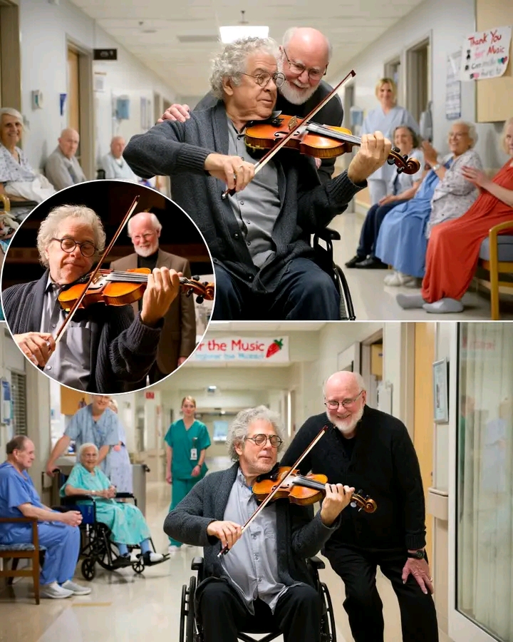 Seated in his black wheelchair, violin legend Itzhak Perlman quietly tuned his instrument in the middle of a hospital hallway. Beside him, composer John Williams, dressed simply in everyday clothes, looked visibly emotional — not at anyone in particular, but at time itself. At what it takes, what it gives, and what it eventually takes away.