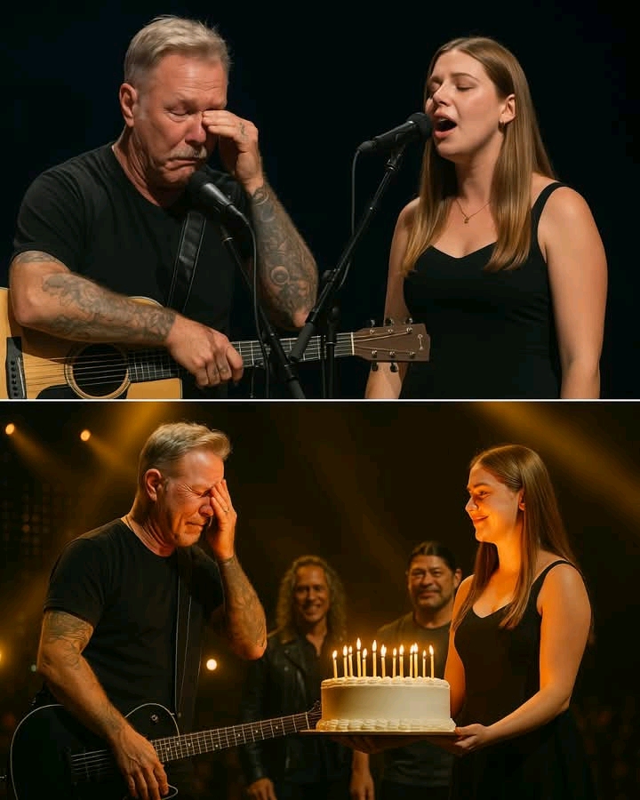 What began as a thunderous Metallica show celebrating James Hetfield’s 61st birthday transformed into one of the most emotional moments of the metal frontman’s life. Midway through the set, as fans braced for the next blistering riff, the atmosphere suddenly shifted when Hetfield’s daughter, Cali, walked on stage unannounced. Clad in simple black and holding a microphone, she approached her father, who froze in shock before covering his face with one hand, visibly overcome with emotion.