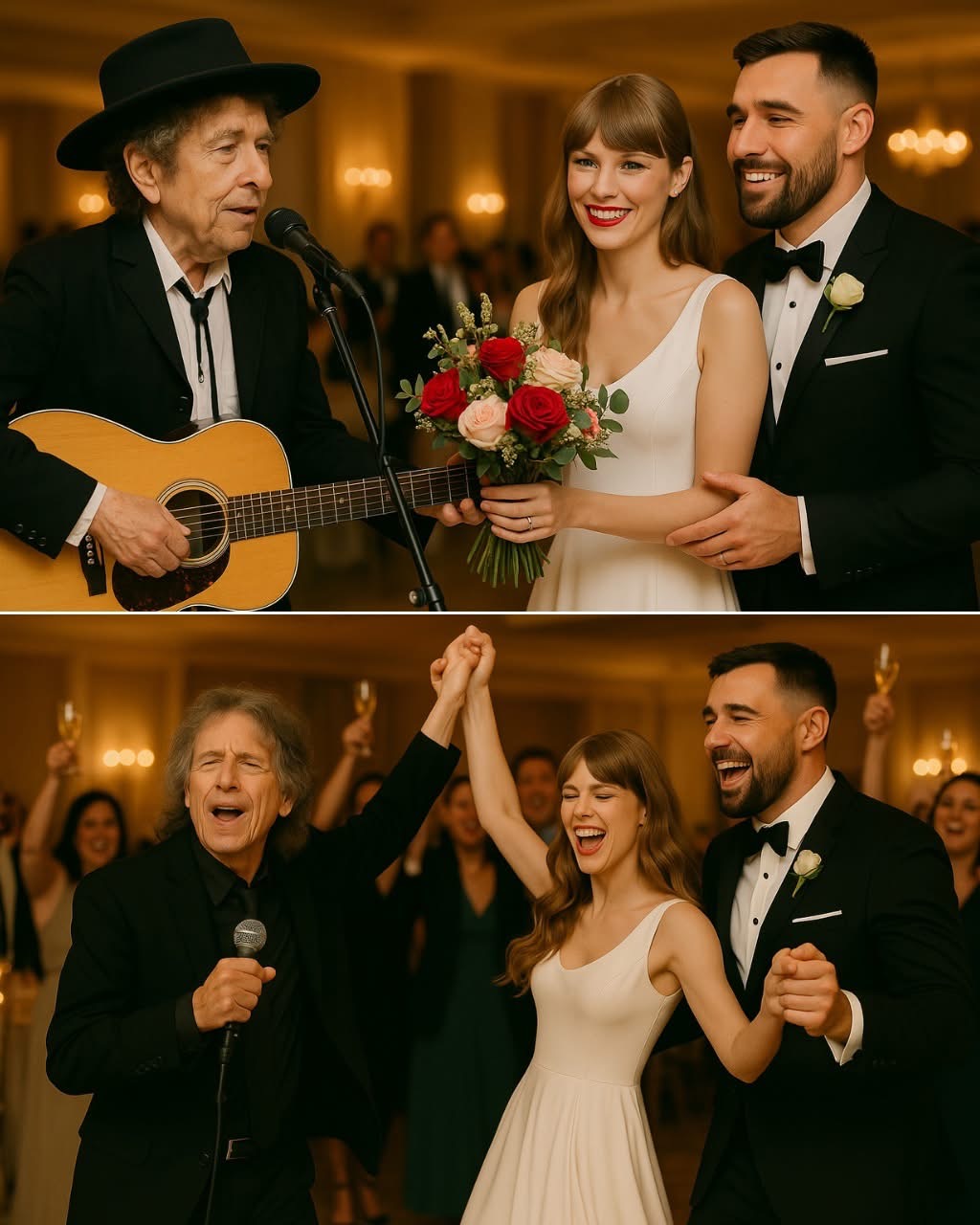 What was already destined to be a wedding for the ages—filled with star power, enchanted elegance, and the unmistakable glow of two worlds colliding—transformed into pure legend when Bob Dylan, the elusive bard of American music, quietly emerged from the shadows. No fanfare, no introduction. Just Dylan, harmonica in hand, guitar slung over his shoulder, and that weathered voice that had once narrated a generation’s hopes and heartbreaks. The crowd, stunned into reverent silence, watched as he stepped onto the intimate stage set inside the candlelit hall where Taylor Swift and Travis Kelce were celebrating their union.