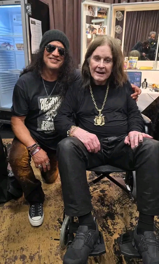 Ozzy, 76, seated in his now-iconic “bat throne,” looked every bit the elder statesman of metal—worn but glowing, overwhelmed by love and legacy. Standing beside him, Slash offered a warm embrace, a symbol of respect from one legend to another. Both artists have walked parallel paths through fame, chaos, reinvention, and triumph—and in that quiet backstage pause, it all seemed to come full circle.