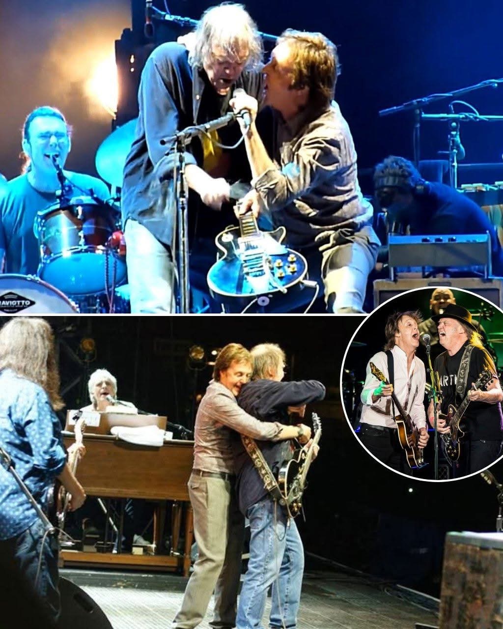 When Neil Young and Paul McCartney took the stage together to perform a Beatles classic, it wasn’t just music—it was a moment carved into the soul. Neil’s guitar bled emotion, each note rough-edged and aching, like the voice of a world that’s seen too much. Paul’s bass thumped beneath it all, steady and warm, the heartbeat of a memory that refuses to fade. Side by side, these two legends didn’t just play a song—they lit a fire in the hearts of everyone who witnessed it.