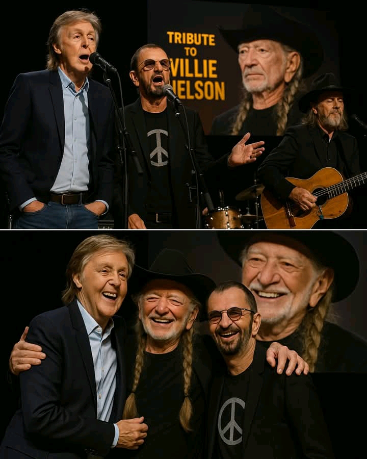 When Paul McCartney and Ringo Starr, the last living Beatles, stood side by side on a candlelit stage to honor their dear friend Willie Nelson in a surprise tribute that left the audience breathless. The event, originally billed as a quiet fundraiser, turned into something sacred the moment the spotlight revealed the two legends embracing in silence before Paul whispered, “This one’s for Willie.” What followed was a haunting acoustic version of “Always on My Mind,” with Paul on guitar and Ringo gently tapping a snare drum, their voices cracked with age but full of soul. A video montage of Willie’s life played behind them — his laughter, his guitar, his years on the road. Fans wept openly. “It felt like saying goodbye to an era,” one guest whispered. Even Paul wiped away a tear mid-song. When the final note fell, the room stayed silent — no clapping, just reverence. “Thank you, Willie,” Ringo said softly, as the stage faded to black.