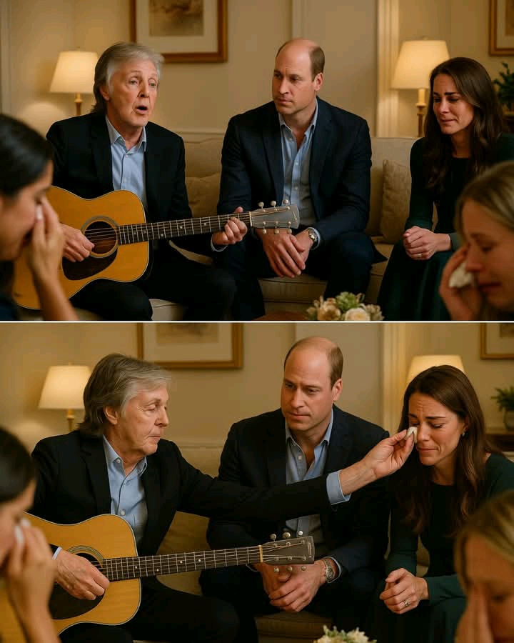 As the guests mingled in the refined ballroom, Paul quietly strummed the first gentle chords of a new song—one he had composed especially for William and Kate. The room fell into hushed reverence as his voice, rich with resonance, threaded through a melody steeped in themes of love, resilience, and togetherness. Princess Kate’s eyes brimmed with tears, while Prince William bowed his head in emotional acknowledgment. The assembled guests felt the weight of the moment—here was music transforming a royal celebration into something ineffably deeper.