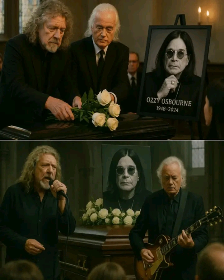 When Robert Plant and Jimmy Page entered the chapel, a ripple of recognition and awe swept through the mourners — two titans of rock, arriving not as legends, but as grieving brothers. Jimmy carried his guitar like a relic, his fingers resting on the strings as though it, too, felt the weight of the moment. Robert stepped to the microphone, his golden curls now silvered with time, and said softly, “We came here for Ozzy… because without him, none of us would have had the courage to be who we were.” Then Jimmy began to play — a slow, mournful riff that bled into the room like an open wound — and Robert followed, his voice still carrying that wild, soaring power, but now tempered with heartbreak. Together, they performed a stripped-down tribute, a haunting mix of blues and lament that felt like a conversation between two old friends and the one they had lost. When the final chord rang out, Robert placed a hand on the casket and whispered, “You’ll always be with us, brother.” The room stayed silent, suspended in the echo of rock and grief intertwined.