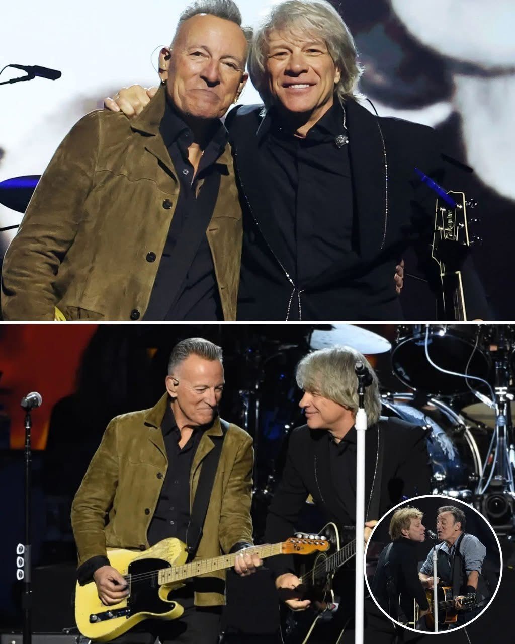 While Bon Jovi was about to strum his guitar and play the first chords of the evening, the atmosphere in New York City was already electric. The crowd was buzzing with excitement, eagerly awaiting the start of what was promised to be a powerful performance. But just as the first notes were about to ring out, an unexpected moment turned the night into something unforgettable. Out of nowhere, Bruce Springsteen emerged from backstage, guitar in hand and a wide grin on his face. The crowd erupted in a deafening roar, stunned and thrilled by the surprise appearance of “The Boss.”